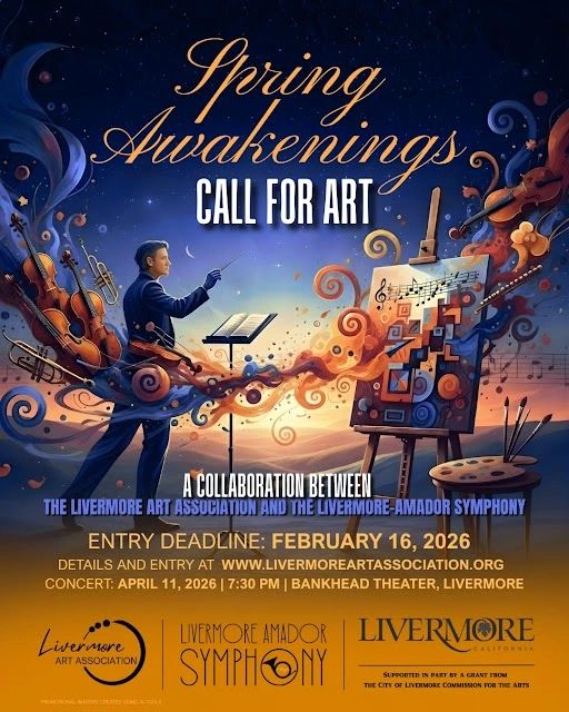 Juried artworks will be featured at the Livermore-Amador Symphony’s concert Spring Awakenings on April 11, 2026, at 7:30 pm at the Bankhead Theater. Selected works will be chosen based on artistic excellence and their ability to visually interpret the music being performed. The artworks will be photographed by LAA and assembled into a silent-film-style video created by a professional videographer, which will be shown during the concert.